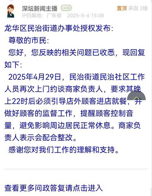 尊敬的市民:您好,您反映的相關(guān)問題已收悉,現(xiàn)回復(fù)如下:2025年4月29日,民治街道民治社區(qū)工作人員再次上門約談商家負(fù)責(zé)人,要求其晚上22時后必須引導(dǎo)店外顧客進(jìn)店就餐,并做好顧客的監(jiān)督工作,提醒顧客控制音量,避免影響周邊居民正常休息。商家負(fù)責(zé)人表示會配合整改。感謝您對我們工作的理解和支持。