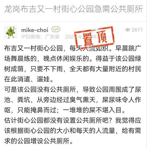 13. 帖文《龍崗布吉又一村街心公園急需公共廁所》