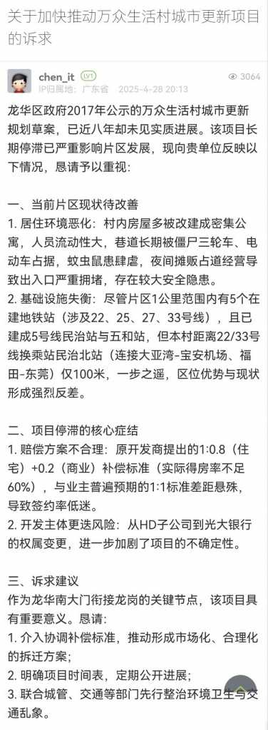 10. 帖文《關(guān)于加快推動萬眾生活村城市更新項目的訴求》