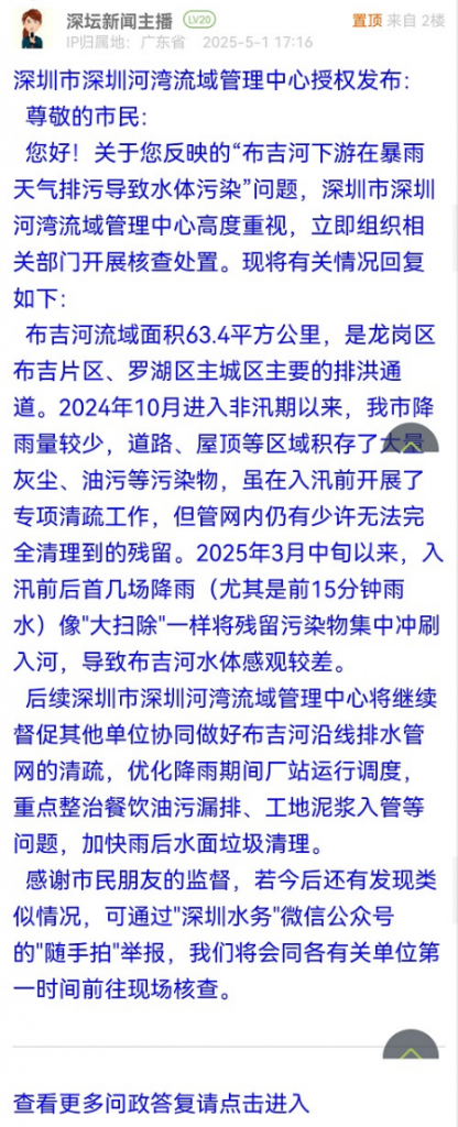 2024年10月進(jìn)入非汛期以來,深圳市降雨量較少,已連續(xù)數(shù)月干旱少雨,道路、屋頂?shù)葏^(qū)域積存了大量灰塵、油污等污染物,雖在入汛前開展了專項清疏工作,但管網(wǎng)內(nèi)仍有少許無法完全清理到的殘留。2025年3月中旬以來,入汛前后首幾場降雨(尤其是前15分鐘雨水)像"大掃除"一樣將殘留污染物集中沖刷入河,導(dǎo)致布吉河水體感觀較差。因此,經(jīng)調(diào)查,暴雨初期布吉河水體渾濁、出現(xiàn)水面漂浮物問題主要與初期雨水面源污染沖刷有關(guān)。