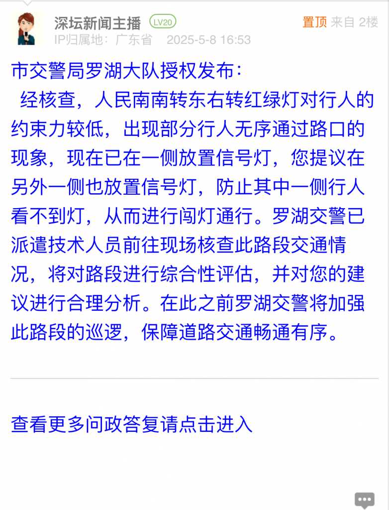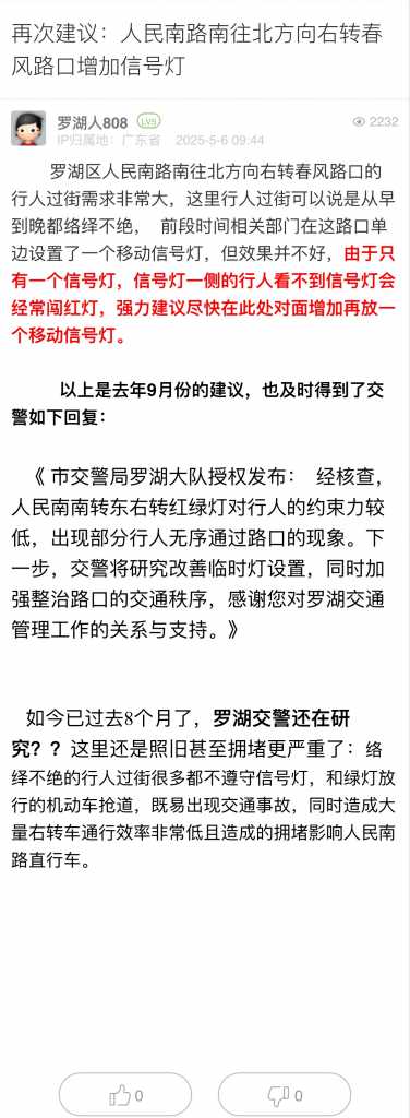 5. 帖文《再次建議:人民南路南往北方向右轉(zhuǎn)春風(fēng)路口增加信號(hào)燈》
