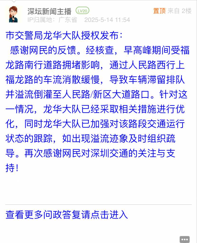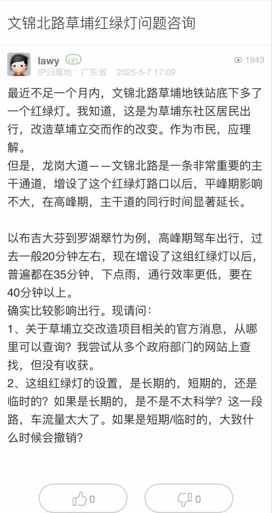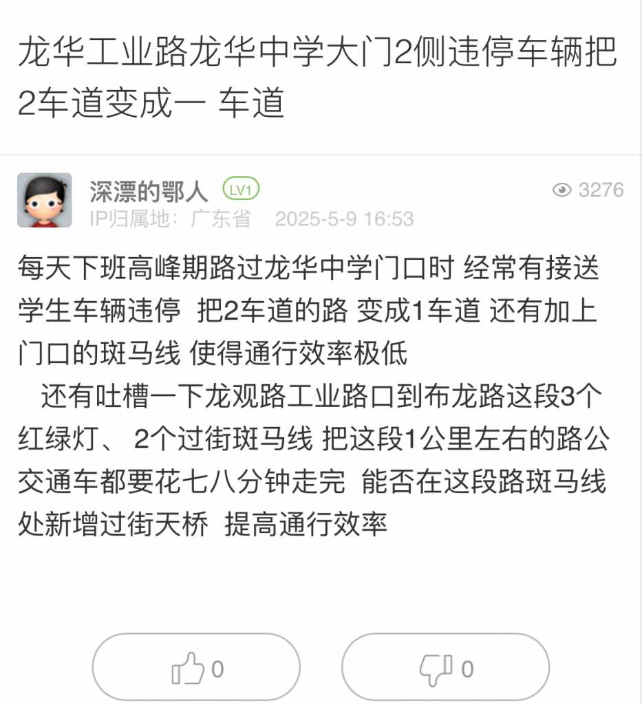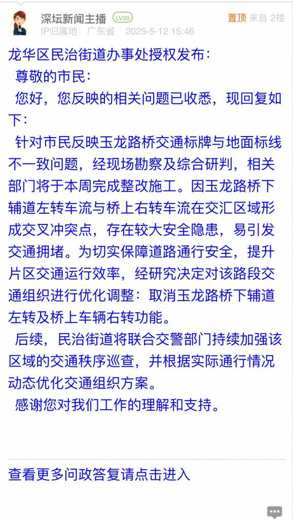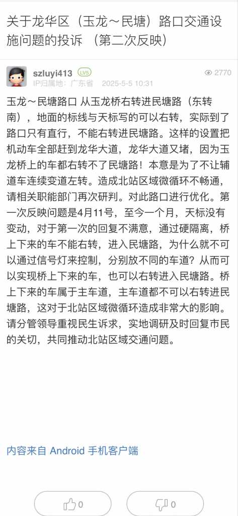 1. 帖文《關(guān)于龍華區(qū)(龍華~玉龍)路口占道施工交通疏解實(shí)施后的建議與訴求》