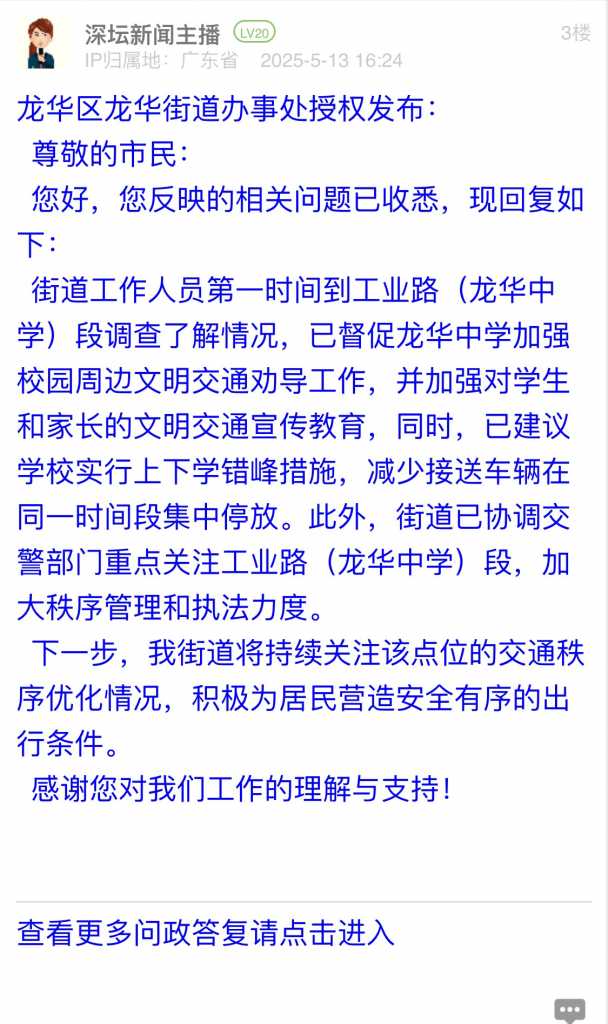 街道工作人員第一時(shí)間到工業(yè)路(龍華中學(xué))段調(diào)查了解情況,已督促龍華中學(xué)加強(qiáng)校園周邊文明交通勸導(dǎo)工作,并加強(qiáng)對(duì)學(xué)生和家長(zhǎng)的文明交通宣傳教育,同時(shí),已建議學(xué)校實(shí)行上下學(xué)錯(cuò)峰措施,減少接送車輛在同一時(shí)間段集中停放。此外,街道已協(xié)調(diào)交警部門重點(diǎn)關(guān)注工業(yè)路(龍華中學(xué))段,加大秩序管理和執(zhí)法力度。