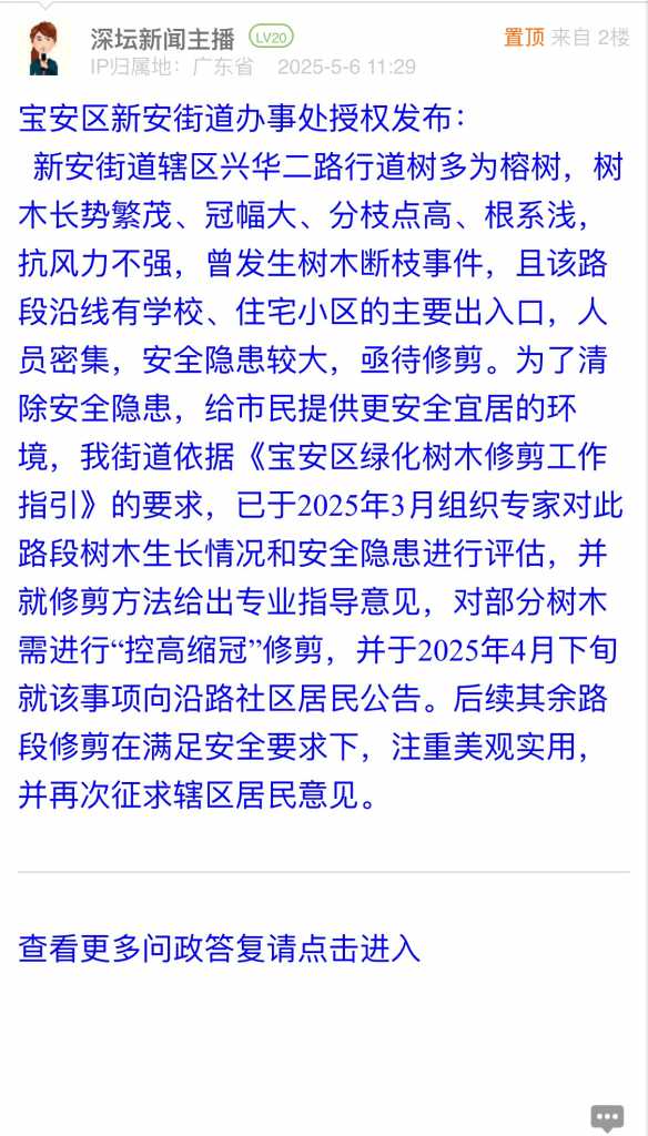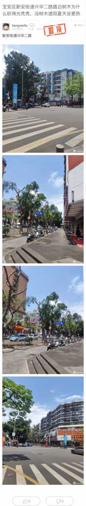 4. 帖文《寶安區(qū)新安街道興華二路路邊樹木為什么砍得光禿禿,沒樹木遮陽(yáng)夏天會(huì)更熱》