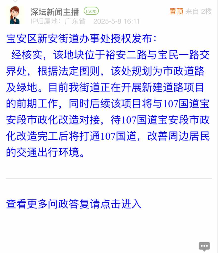 經(jīng)核實(shí),該地塊位于裕安二路與寶民一路交界處,根據(jù)法定圖則,該處規(guī)劃為市政道路及綠地。目前我街道正在開展新建道路項(xiàng)目的前期工作,同時(shí)后續(xù)該項(xiàng)目將與107國(guó)道寶安段市政化改造對(duì)接,待107國(guó)道寶安段市政化改造完工后將打通107國(guó)道,改善周邊居民的交通出行環(huán)境。