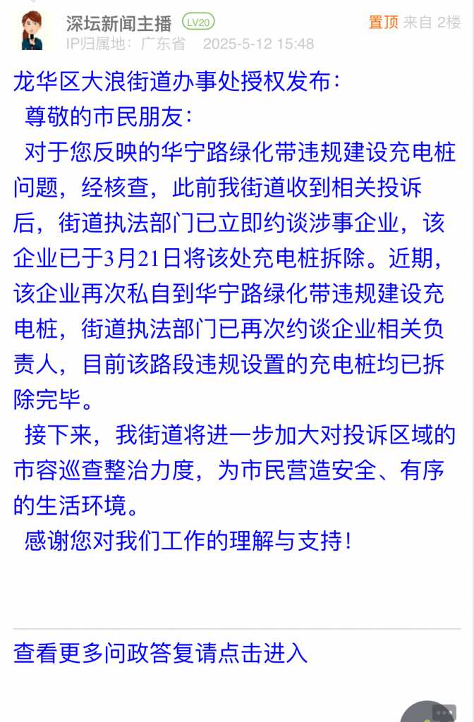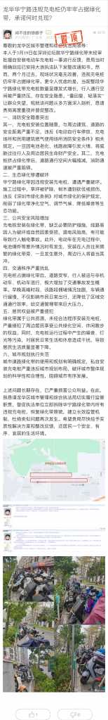 10. 帖文《龍華華寧路違規(guī)充電樁仍牢牢占據(jù)綠化帶,承諾何時(shí)兌現(xiàn)?》