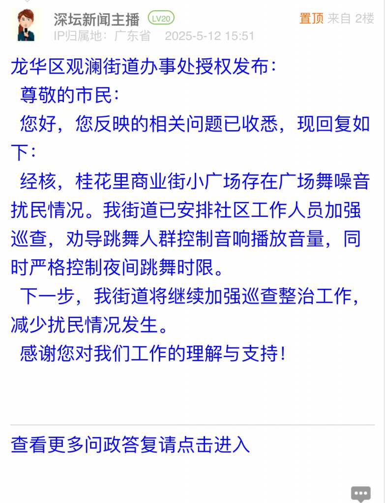 經(jīng)核,桂花里商業(yè)街小廣場(chǎng)存在廣場(chǎng)舞噪音擾民情況。我街道已安排社區(qū)工作人員加強(qiáng)巡查,勸導(dǎo)跳舞人群控制音響播放音量,同時(shí)嚴(yán)格控制夜間跳舞時(shí)限。