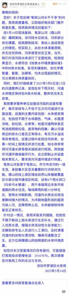 同時(shí),我們仔細(xì)核查了2025年5月8日至13日的河道管養(yǎng)記錄,發(fā)現(xiàn)在非下雨天時(shí),河道水體穩(wěn)定保持在Ⅲ類水標(biāo)準(zhǔn),整體狀況未見異常。