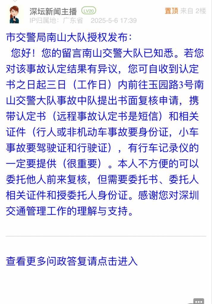 您好!您的留言南山交警大隊(duì)已知悉。若您對(duì)該事故認(rèn)定結(jié)果有異議,您可自收到認(rèn)定書之日起三日(工作日)內(nèi)前往玉園路3號(hào)南山交警大隊(duì)事故中隊(duì)提出書面復(fù)核申請(qǐng),攜帶認(rèn)定書(遠(yuǎn)程事故認(rèn)定書是短信)和相關(guān)證件(行人或非機(jī)動(dòng)車事故要身份證,小車事故要駕駛證和行駛證),有行車記錄儀的一定要提供(很重要)。本人不方便的可以委托他人前來復(fù)核,但需要委托書、委托人相關(guān)證件和授委托人身份證。感謝您對(duì)深圳交通管理工作的理解與支持。