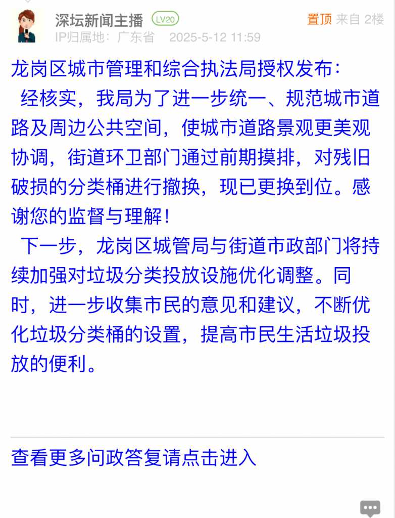 經(jīng)核實(shí),我局為了進(jìn)一步統(tǒng)一、規(guī)范城市道路及周邊公共空間,使城市道路景觀更美觀協(xié)調(diào),街道環(huán)衛(wèi)部門通過前期摸排,對(duì)殘舊破損的分類桶進(jìn)行撤換,現(xiàn)已更換到位。感謝您的監(jiān)督與理解!