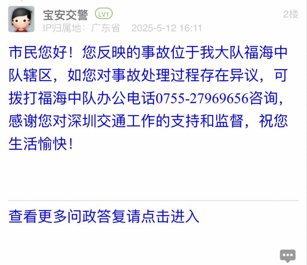 市民您好!您反映的事故位于我大隊(duì)福海中隊(duì)轄區(qū),如您對(duì)事故處理過程存在異議,可撥打福海中隊(duì)辦公電話0755-27969656咨詢,感謝您對(duì)深圳交通工作的支持和監(jiān)督,祝您生活愉快!