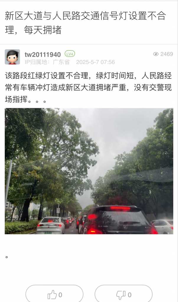 11. 帖文《新區(qū)大道與人民路交通信號(hào)燈設(shè)置不合理,每天擁堵》