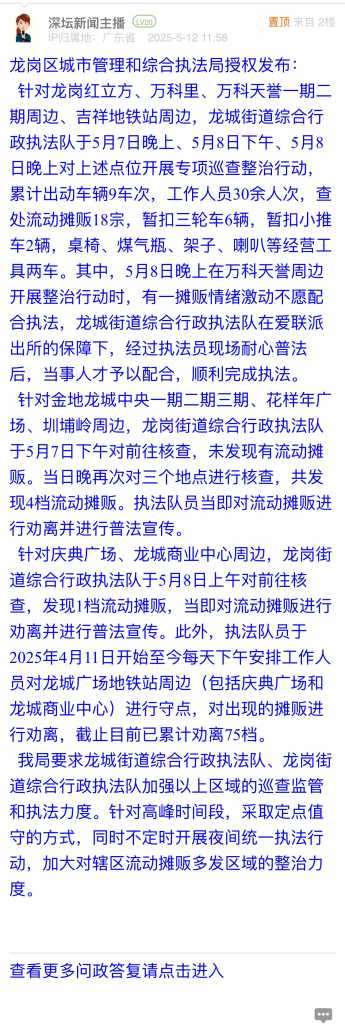 針對(duì)慶典廣場(chǎng)、龍城商業(yè)中心周邊,龍崗街道綜合行政執(zhí)法隊(duì)于5月8日上午對(duì)前往核查,發(fā)現(xiàn)1檔流動(dòng)攤販,當(dāng)即對(duì)流動(dòng)攤販進(jìn)行勸離并進(jìn)行普法宣傳。此外,執(zhí)法隊(duì)員于2025年4月11日開始至今每天下午安排工作人員對(duì)龍城廣場(chǎng)地鐵站周邊(包括慶典廣場(chǎng)和龍城商業(yè)中心)進(jìn)行守點(diǎn),對(duì)出現(xiàn)的攤販進(jìn)行勸離,截止目前已累計(jì)勸離75檔。