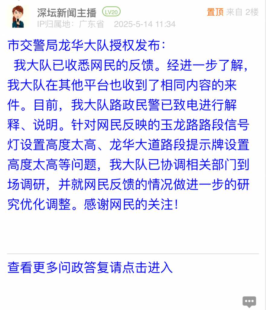 我大隊(duì)已收悉網(wǎng)民的反饋。經(jīng)進(jìn)一步了解,我大隊(duì)在其他平臺(tái)也收到了相同內(nèi)容的來件。目前,我大隊(duì)路政民警已致電進(jìn)行解釋、說明。針對(duì)網(wǎng)民反映的玉龍路路段信號(hào)燈設(shè)置高度太高、龍華大道路段提示牌設(shè)置高度太高等問題,我大隊(duì)已協(xié)調(diào)相關(guān)部門到場(chǎng)調(diào)研,并就網(wǎng)民反饋的情況做進(jìn)一步的研究?jī)?yōu)化調(diào)整。感謝網(wǎng)民的關(guān)注!