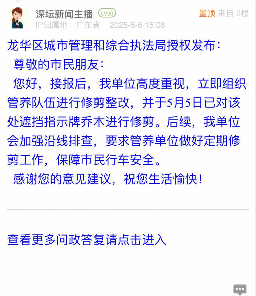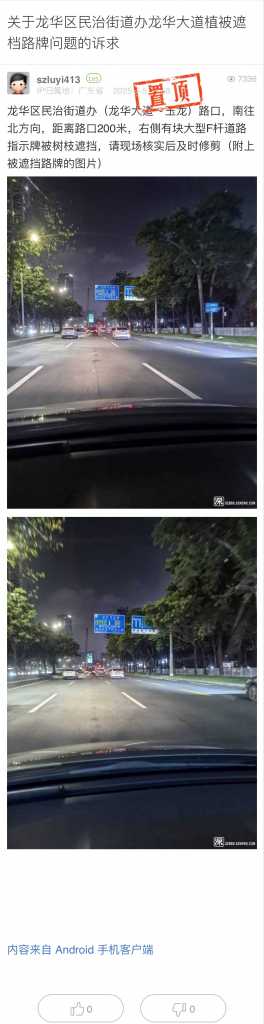 2. 帖文《關(guān)于龍華區(qū)民治街道辦龍華大道植被遮檔路牌問題的訴求》