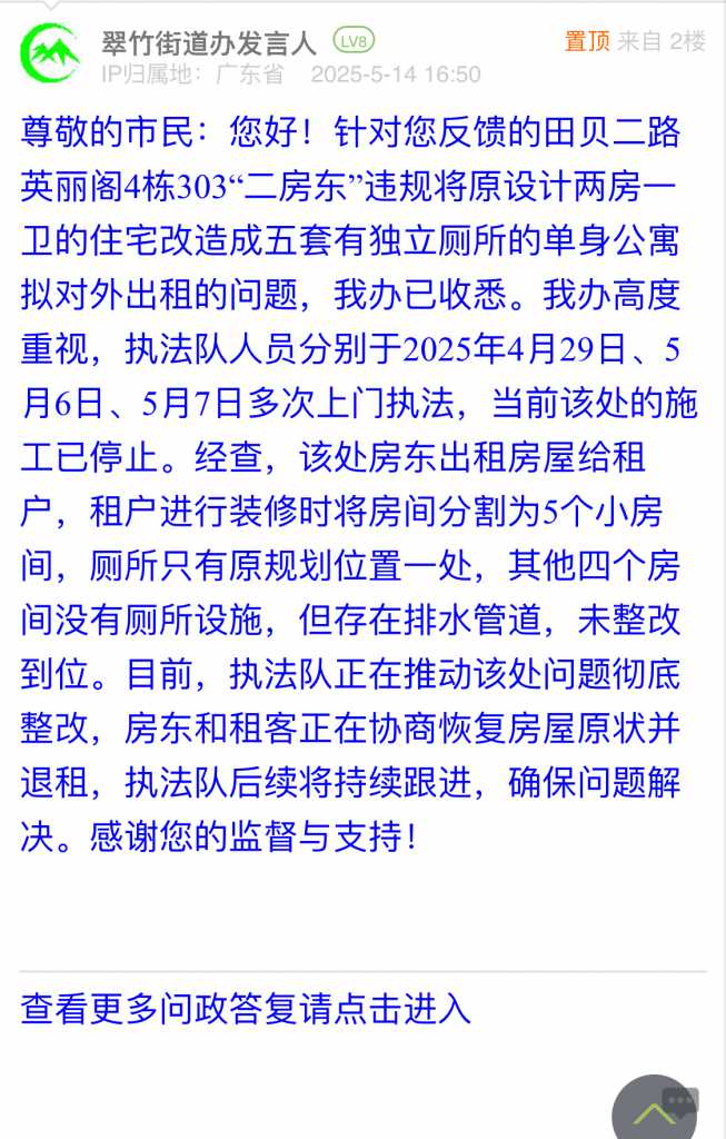 尊敬的市民:您好!針對(duì)您反饋的田貝二路英麗閣4棟303“二房東”違規(guī)將原設(shè)計(jì)兩房一衛(wèi)的住宅改造成五套有獨(dú)立廁所的單身公寓擬對(duì)外出租的問題,我辦已收悉。我辦高度重視,執(zhí)法隊(duì)人員分別于2025年4月29日、5月6日、5月7日多次上門執(zhí)法,當(dāng)前該處的施工已停止。經(jīng)查,該處房東出租房屋給租戶,租戶進(jìn)行裝修時(shí)將房間分割為5個(gè)小房間,廁所只有原規(guī)劃位置一處,其他四個(gè)房間沒有廁所設(shè)施,但存在排水管道,未整改到位。目前,執(zhí)法隊(duì)正在推動(dòng)該處問題徹底整改,房東和租客正在協(xié)商恢復(fù)房屋原狀并退租,執(zhí)法隊(duì)后續(xù)將持續(xù)跟進(jìn),確保問題解決。感謝您的監(jiān)督與支持!