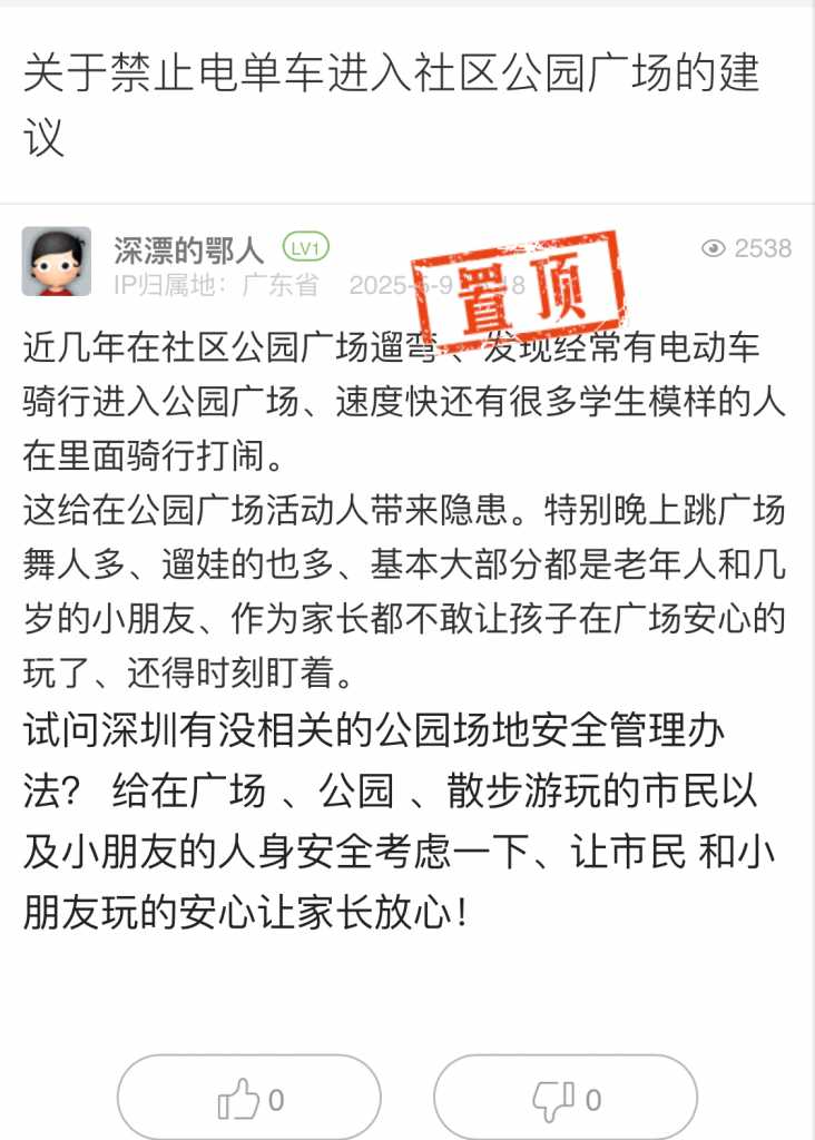 19. 帖文《關(guān)于禁止電單車進(jìn)入社區(qū)公園廣場(chǎng)的建議》