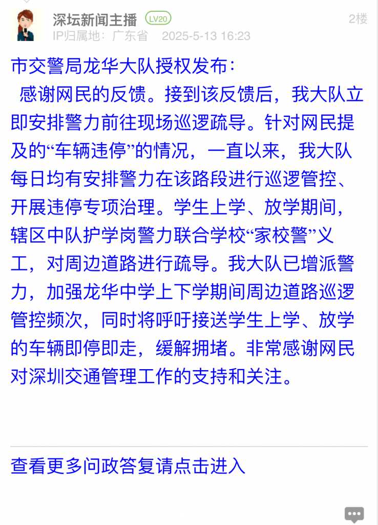感謝網(wǎng)民的反饋。接到該反饋后,我大隊(duì)立即安排警力前往現(xiàn)場(chǎng)巡邏疏導(dǎo)。針對(duì)網(wǎng)民提及的“車輛違?!钡那闆r,一直以來,我大隊(duì)每日均有安排警力在該路段進(jìn)行巡邏管控、開展違停專項(xiàng)治理。學(xué)生上學(xué)、放學(xué)期間,轄區(qū)中隊(duì)護(hù)學(xué)崗警力聯(lián)合學(xué)?!凹倚>绷x工,對(duì)周邊道路進(jìn)行疏導(dǎo)。我大隊(duì)已增派警力,加強(qiáng)龍華中學(xué)上下學(xué)期間周邊道路巡邏管控頻次,同時(shí)將呼吁接送學(xué)生上學(xué)、放學(xué)的車輛即停即走,緩解擁堵。非常感謝網(wǎng)民對(duì)深圳交通管理工作的支持和關(guān)注。