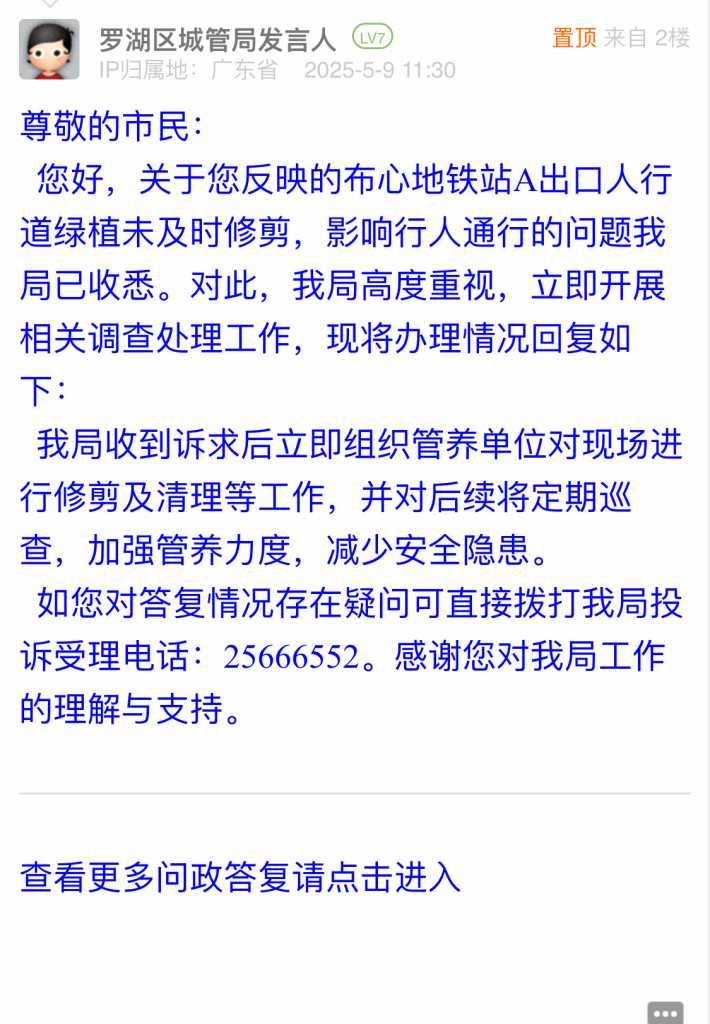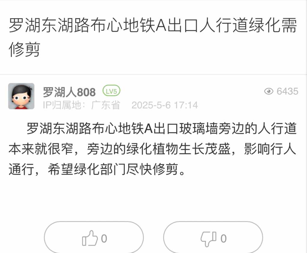 9. 帖文《羅湖東湖路布心地鐵A出口人行道綠化需修剪》