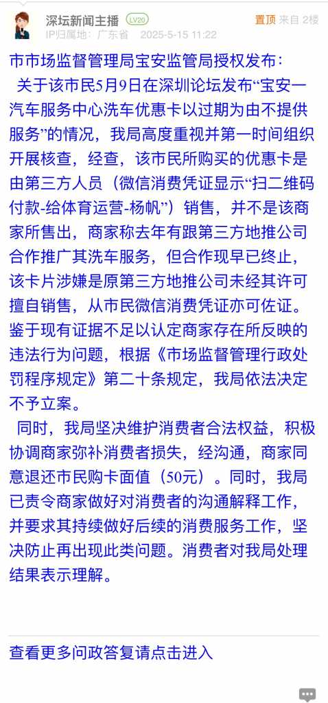 關(guān)于該市民5月9日在深圳論壇發(fā)布“寶安一汽車服務(wù)中心洗車優(yōu)惠卡以過期為由不提供服務(wù)”的情況,我局高度重視并第一時(shí)間組織開展核查,經(jīng)查,該市民所購(gòu)買的優(yōu)惠卡是由第三方人員(微信消費(fèi)憑證顯示“掃二維碼付款-給體育運(yùn)營(yíng)-楊帆”)銷售,并不是該商家所售出,商家稱去年有跟第三方地推公司合作推廣其洗車服務(wù),但合作現(xiàn)早已終止,該卡片涉嫌是原第三方地推公司未經(jīng)其許可擅自銷售,從市民微信消費(fèi)憑證亦可佐證。鑒于現(xiàn)有證據(jù)不足以認(rèn)定商家存在所反映的違法行為問題,根據(jù)《市場(chǎng)監(jiān)督管理行政處罰程序規(guī)定》第二十條規(guī)定,我局依法決定不予立案。