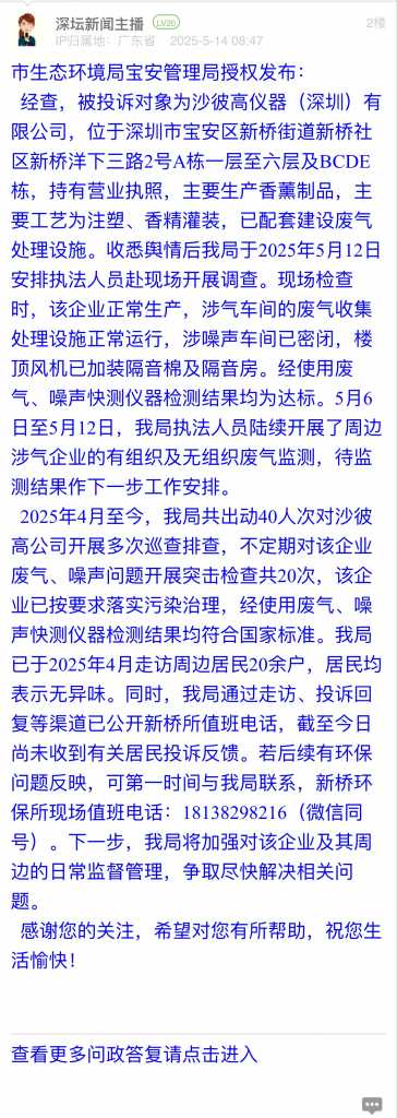 經(jīng)查,被投訴對(duì)象為沙彼高儀器(深圳)有限公司,位于深圳市寶安區(qū)新橋街道新橋社區(qū)新橋洋下三路2號(hào)A棟一層至六層及BCDE棟,持有營(yíng)業(yè)執(zhí)照,主要生產(chǎn)香薰制品,主要工藝為注塑、香精灌裝,已配套建設(shè)廢氣處理設(shè)施。收悉輿情后我局于2025年5月12日安排執(zhí)法人員赴現(xiàn)場(chǎng)開展調(diào)查?,F(xiàn)場(chǎng)檢查時(shí),該企業(yè)正常生產(chǎn),涉氣車間的廢氣收集處理設(shè)施正常運(yùn)行,涉噪聲車間已密閉,樓頂風(fēng)機(jī)已加裝隔音棉及隔音房。經(jīng)使用廢氣、噪聲快測(cè)儀器檢測(cè)結(jié)果均為達(dá)標(biāo)。5月6日至5月12日,我局執(zhí)法人員陸續(xù)開展了周邊涉氣企業(yè)的有組織及無組織廢氣監(jiān)測(cè),待監(jiān)測(cè)結(jié)果作下一步工作安排。