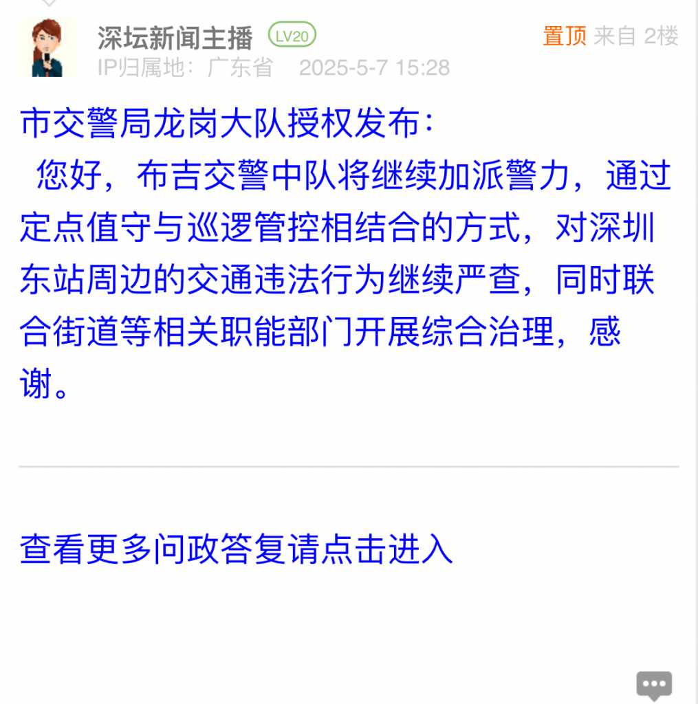 您好,布吉交警中隊(duì)將繼續(xù)加派警力,通過定點(diǎn)值守與巡邏管控相結(jié)合的方式,對(duì)深圳東站周邊的交通違法行為繼續(xù)嚴(yán)查,同時(shí)聯(lián)合街道等相關(guān)職能部門開展綜合治理,感謝。