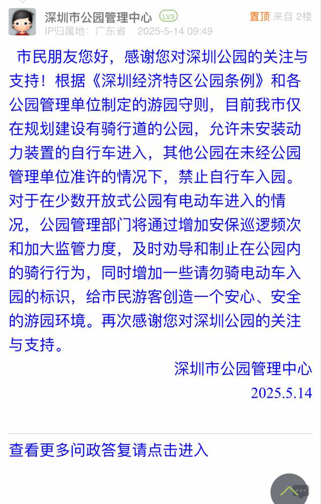 市民朋友您好,感謝您對(duì)深圳公園的關(guān)注與支持!根據(jù)《深圳經(jīng)濟(jì)特區(qū)公園條例》和各公園管理單位制定的游園守則,目前我市僅在規(guī)劃建設(shè)有騎行道的公園,允許未安裝動(dòng)力裝置的自行車進(jìn)入,其他公園在未經(jīng)公園管理單位準(zhǔn)許的情況下,禁止自行車入園。對(duì)于在少數(shù)開放式公園有電動(dòng)車進(jìn)入的情況,公園管理部門將通過增加安保巡邏頻次和加大監(jiān)管力度,及時(shí)勸導(dǎo)和制止在公園內(nèi)的騎行行為,同時(shí)增加一些請(qǐng)勿騎電動(dòng)車入園的標(biāo)識(shí),給市民游客創(chuàng)造一個(gè)安心、安全的游園環(huán)境。再次感謝您對(duì)深圳公園的關(guān)注與支持。