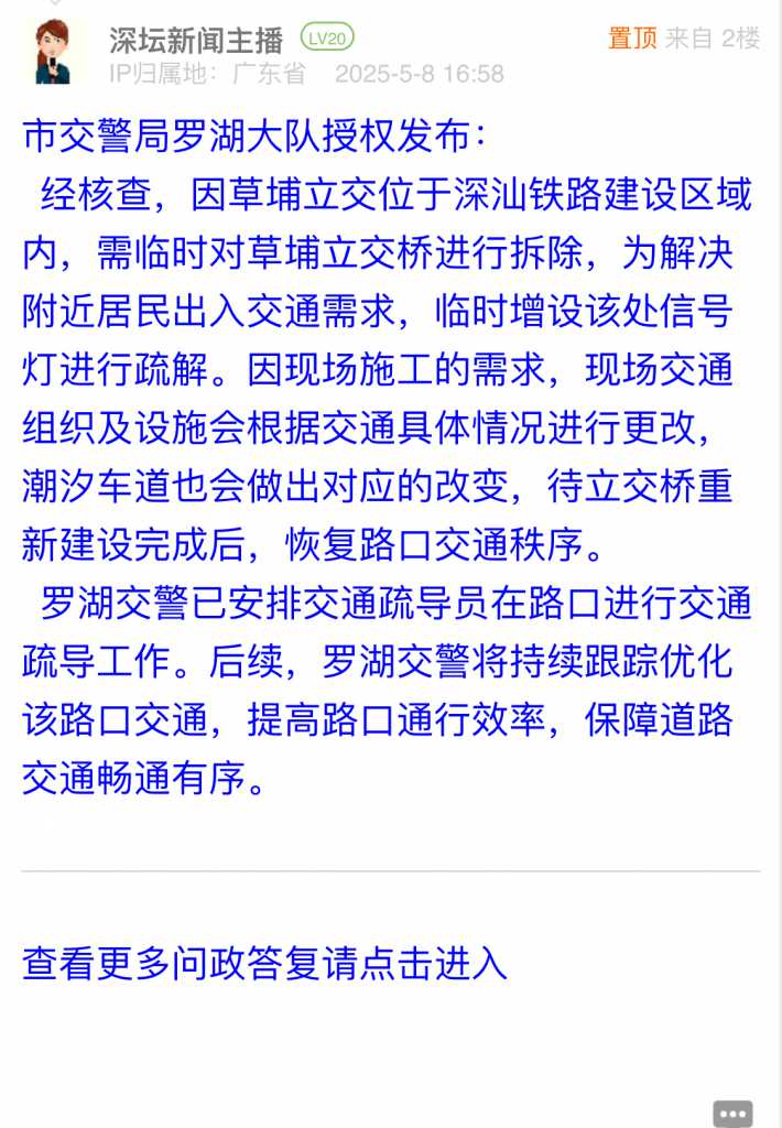 經(jīng)核查,因草埔立交位于深汕鐵路建設(shè)區(qū)域內(nèi),需臨時(shí)對(duì)草埔立交橋進(jìn)行拆除,為解決附近居民出入交通需求,臨時(shí)增設(shè)該處信號(hào)燈進(jìn)行疏解。因現(xiàn)場(chǎng)施工的需求,現(xiàn)場(chǎng)交通組織及設(shè)施會(huì)根據(jù)交通具體情況進(jìn)行更改,潮汐車道也會(huì)做出對(duì)應(yīng)的改變,待立交橋重新建設(shè)完成后,恢復(fù)路口交通秩序。
