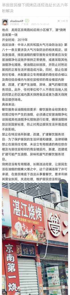 13. 帖文《舉報居民樓下燒烤店違規(guī)選址長達(dá)六年盼解決》
