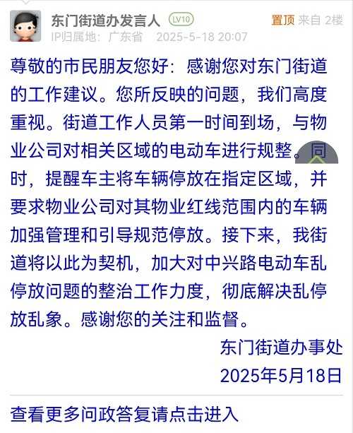 尊敬的市民朋友您好:感謝您對東門街道的工作建議。您所反映的問題,我們高度重視。街道工作人員第一時間到場,與物業(yè)公司對相關(guān)區(qū)域的電動車進(jìn)行規(guī)整。同時,提醒車主將車輛停放在指定區(qū)域,并要求物業(yè)公司對其物業(yè)紅線范圍內(nèi)的車輛加強(qiáng)管理和引導(dǎo)規(guī)范停放。接下來,我街道將以此為契機(jī),加大對中興路電動車亂停放問題的整治工作力度,徹底解決亂停放亂象。感謝您的關(guān)注和監(jiān)督。
