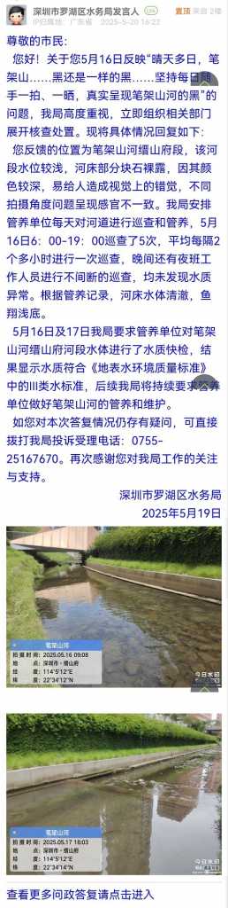 您反饋的位置為筆架山河縉山府段,該河段水位較淺,河床部分塊石裸露,因其顏色較深,易給人造成視覺上的錯覺,不同拍攝角度問題呈現(xiàn)感官不一致。我局安排管養(yǎng)單位每天對河道進(jìn)行巡查和管養(yǎng),5月16日6:00-19:00巡查了5次,平均每隔2個多小時進(jìn)行一次巡查,晚間還有夜班工作人員進(jìn)行不間斷的巡查,均未發(fā)現(xiàn)水質(zhì)異常。根據(jù)管養(yǎng)記錄,河床水體清澈,魚翔淺底。