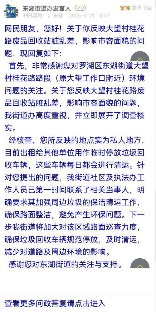 網(wǎng)民朋友,您好!關(guān)于你反映大望村桂花路廢品回收站臟亂差,影響市容面貌的問題,現(xiàn)回復(fù)如下:首先,非常感謝您對羅湖區(qū)東湖街道大望村桂花路路段(原大望工作口附近)環(huán)境問題的關(guān)注。關(guān)于您反映大望村桂花路廢品回收站臟亂差,影響市容面貌的問題,我街道辦高度重視,并立即展開了調(diào)查核實。經(jīng)核查,您所反映的地點實為私人地方,目前出租給其他單位用作臨時停放垃圾回收車輛,這些車輛每日都會進(jìn)行清運(yùn)。針對您提出的問題,我街道社區(qū)及執(zhí)法辦工作人員已第一時間聯(lián)系了相關(guān)當(dāng)事人,明確要求其加強(qiáng)周邊垃圾的保潔清運(yùn)工作,確保路面整潔,避免產(chǎn)生環(huán)保問題。下一步我街道將加大對該區(qū)域路面巡查力度,確保垃圾回收車輛規(guī)范停放,及時清運(yùn),減少對道路及周邊環(huán)境的影響。感謝您對東湖街道的關(guān)注與支持。