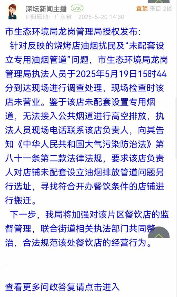 針對反映的燒烤店油煙擾民及“未配套設(shè)立專用油煙管道”問題,市生態(tài)環(huán)境局龍崗管理局執(zhí)法人員于2025年5月19日15時44分到達(dá)現(xiàn)場進(jìn)行調(diào)查處理,現(xiàn)場檢查時該店未營業(yè)。鑒于該店未配套設(shè)置專用煙道,無法接入公共煙道進(jìn)行高空排放,執(zhí)法人員現(xiàn)場電話聯(lián)系該店負(fù)責(zé)人,向其告知《中華人民共和國大氣污染防治法》第八十一條第二款法律法規(guī),要求該店負(fù)責(zé)人對店鋪未配套設(shè)立油煙排放管道問題另行選址,尋找符合開辦餐飲條件的店鋪進(jìn)行搬遷。下一步,我局將加強(qiáng)對該片區(qū)餐飲店的監(jiān)督管理,聯(lián)合街道相關(guān)執(zhí)法部門共同整治,合法規(guī)范該處餐飲店的經(jīng)營行為。
