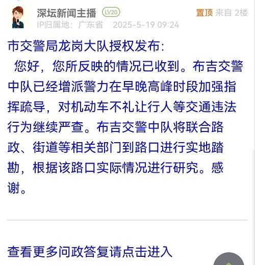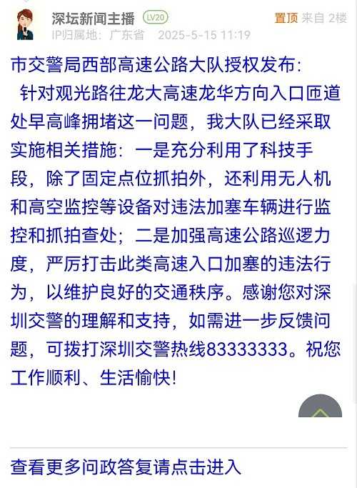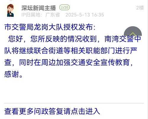 據(jù)統(tǒng)計,2025年5月12日-2025年5月18日,網(wǎng)友在深圳論壇發(fā)布問政類帖文共29篇,得到相關(guān)單位正式回應(yīng)的帖文數(shù)為26篇,本期簡報回應(yīng)速度最快的單位:市交警局龍崗大隊、市交警局西部高速公路大隊。