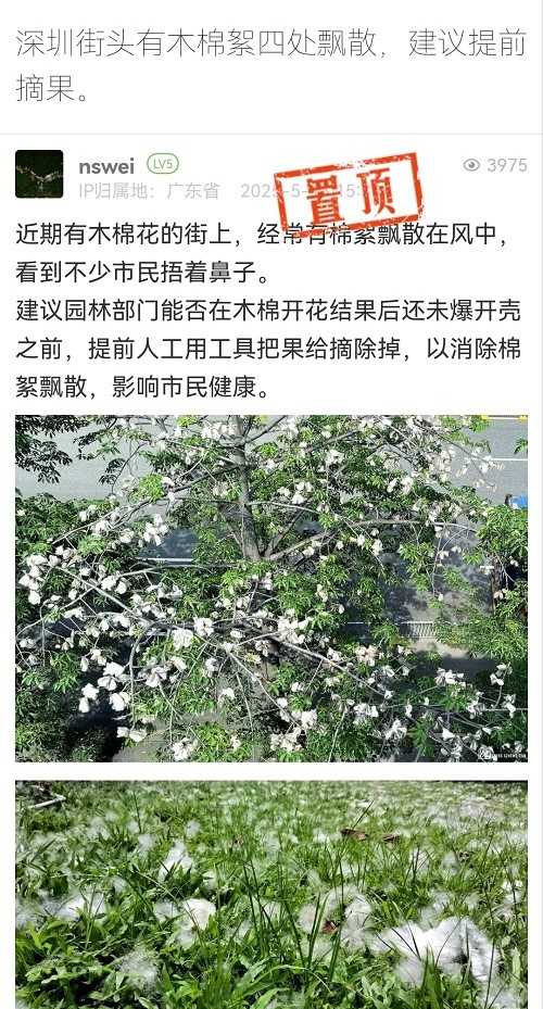 22. 帖文《深圳街頭有木棉絮四處飄散,建議提前摘果。》