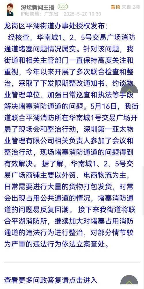 經(jīng)核查,華南城1、2、5號交易廣場消防通道堵塞問題情況屬實。針對該問題,我街道和相關(guān)主管部門一直保持高度關(guān)注和重視,今年以來開展了多次聯(lián)合檢查和整治,采取了下發(fā)限期整改通知書、約談物業(yè)管理單位、加強(qiáng)日常巡查和執(zhí)法等手段解決堵塞消防通道的問題。5月16日,我街道聯(lián)合平湖消防所在華南城1號交易廣場開展了現(xiàn)場會和整治行動,深圳第一亞太物業(yè)管理有限公司相關(guān)負(fù)責(zé)人參加了會議和整治行動,現(xiàn)場堵塞消防通道的問題得到有效解決。 據(jù)了解,華南城1、2、5號交易廣場商鋪主要以外貿(mào)、電商物流為主,日常需要進(jìn)行大量的貨物打包發(fā)貨,時常會出現(xiàn)占用公共通道的情況,堵塞消防通道的問題易反復(fù)回潮。 接下來我街道將聯(lián)合平湖消防所,繼續(xù)加大對堵塞占用消防通道的違法行為進(jìn)行整治,對部分情節(jié)較為嚴(yán)重的違法行為依法立案查處。