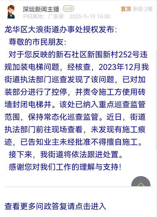 尊敬的市民朋友:對于您反映的新石社區(qū)新圍新村252號違規(guī)加裝電梯問題,經(jīng)核查,2023年12月我街道執(zhí)法部門巡查發(fā)現(xiàn)了該問題,已對加裝部分進(jìn)行了控停,并責(zé)令施工方使用磚墻封閉電梯井。該處已納入重點巡查監(jiān)管范圍,保持常態(tài)化巡查監(jiān)管。近日,街道執(zhí)法部門前往現(xiàn)場查看,未發(fā)現(xiàn)有施工痕跡,已告知業(yè)主未經(jīng)批準(zhǔn)不得擅自施工。接下來,我街道將依法跟進(jìn)處置。感謝您對我們工作的理解與支持!
