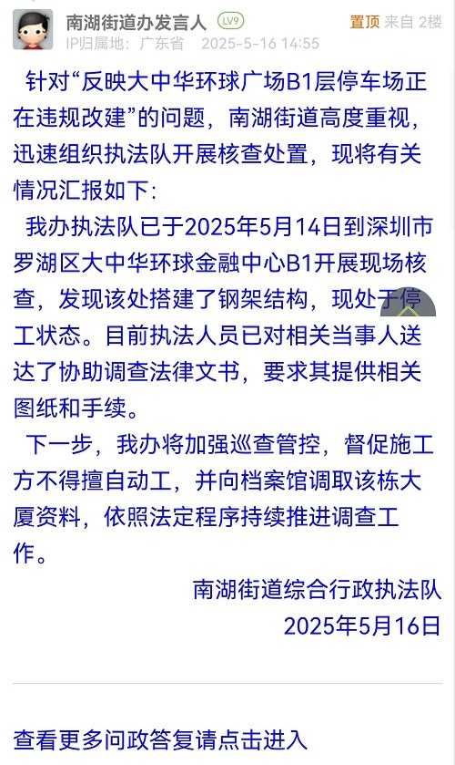 針對“反映大中華環(huán)球廣場B1層停車場正在違規(guī)改建”的問題,南湖街道高度重視,迅速組織執(zhí)法隊開展核查處置,現(xiàn)將有關(guān)情況匯報如下:我辦執(zhí)法隊已于2025年5月14日到深圳市羅湖區(qū)大中華環(huán)球金融中心B1開展現(xiàn)場核查,發(fā)現(xiàn)該處搭建了鋼架結(jié)構(gòu),現(xiàn)處于停工狀態(tài)。目前執(zhí)法人員已對相關(guān)當(dāng)事人送達(dá)了協(xié)助調(diào)查法律文書,要求其提供相關(guān)圖紙和手續(xù)。下一步,我辦將加強(qiáng)巡查管控,督促施工方不得擅自動工,并向檔案館調(diào)取該棟大廈資料,依照法定程序持續(xù)推進(jìn)調(diào)查工作。