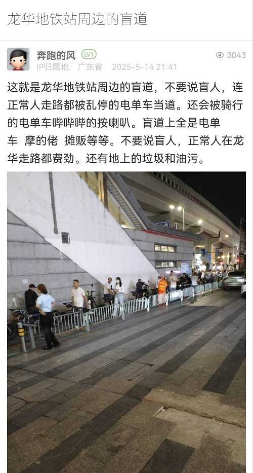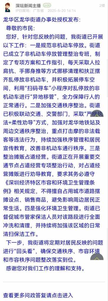 尊敬的市民:您好,針對您反映的問題,我街道已開展以下工作:一是規(guī)范非機(jī)動車停放。街道已成立了非機(jī)動車停放管理整治專班,制定了專項方案和工作指引,每天采取人拉肩抗、手挪身推等方式挪移清理和扶正擺齊亂停放非機(jī)動車,并積極拓展停車空間,利用“掃碼尋車”小程序?qū)y停放的非機(jī)動車進(jìn)行“異地移管”,全力保障行人的正常通行。二是加強(qiáng)交通秩序整治。街道已積極聯(lián)動交通、交警部門,采取“嚴(yán)格執(zhí)法+柔性勸導(dǎo)”方式,加強(qiáng)對龍華地鐵站及周邊交通秩序整治,重點打擊摩的非法載客等違法行為,持續(xù)加強(qiáng)秩序管理和居民宣傳教育,改善非機(jī)動車通行秩序。三是整治攤販占道經(jīng)營。街道正在開展重要交通節(jié)點占道經(jīng)營專項整治行動,對占道經(jīng)營攤販進(jìn)行勸導(dǎo)教育,要求其務(wù)必遵守《深圳經(jīng)濟(jì)特區(qū)市容和環(huán)境衛(wèi)生管理條例》相關(guān)規(guī)定,不得擅自占用城市道路擺攤設(shè)點、銷售商品,避免影響周邊居民正常生活。四是強(qiáng)化環(huán)境衛(wèi)生管理。街道已督促城市管家保潔人員對該路段進(jìn)行全面沖洗和清理,并持續(xù)將加強(qiáng)該區(qū)域的日常清掃保潔工作。下一步,我街道將定期對居民反映的問題進(jìn)行“回頭看”,確保交通秩序、市容環(huán)境和市容秩序問題整改落實到位。感謝您對我們工作的理解和支持。