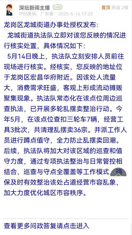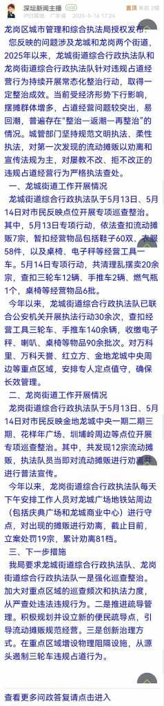 您反映的問題涉及龍城和龍崗兩個街道,2025年以來,龍城街道綜合行政執(zhí)法隊和龍崗街道綜合行政執(zhí)法隊針對違規(guī)占道經(jīng)營行為持續(xù)開展常態(tài)化整治行動,取得一定整治成效。當(dāng)前受經(jīng)濟(jì)形勢下行影響,擺攤?cè)后w增多,占道經(jīng)營問題較突出,易回潮,普遍存在“整治—返潮—再整治”的情況。城管部門堅持規(guī)范文明執(zhí)法、柔性執(zhí)法,對第一次發(fā)現(xiàn)的流動攤販以勸離和宣傳法規(guī)為主,對屢教不改、拒不改正的違規(guī)占道經(jīng)營行為嚴(yán)格執(zhí)法查處。