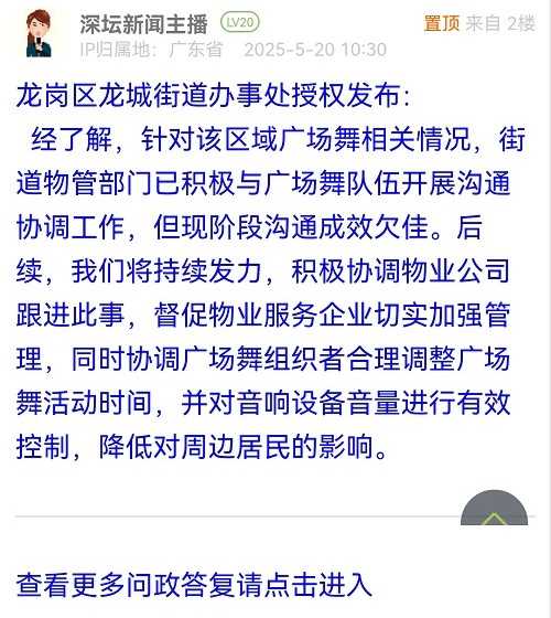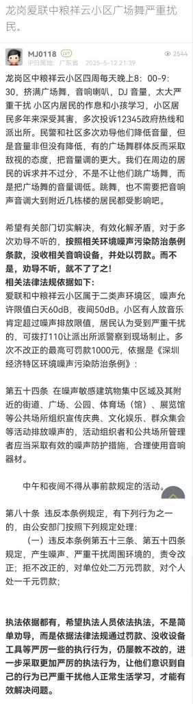 2. 帖文《龍崗愛聯(lián)中糧祥云小區(qū)廣場舞嚴(yán)重擾民。》