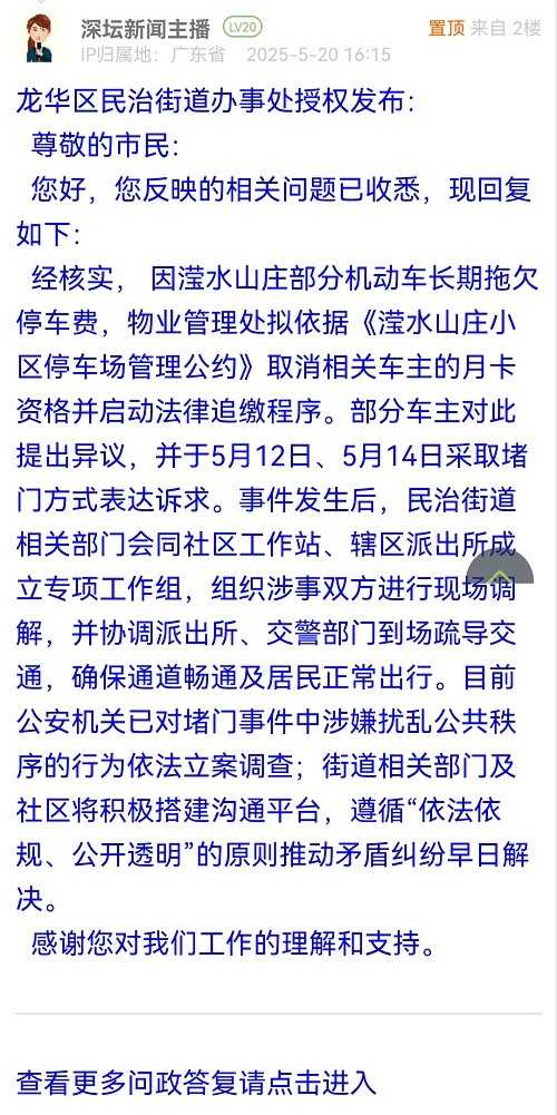 尊敬的市民:您好,您反映的相關(guān)問題已收悉,現(xiàn)回復(fù)如下:經(jīng)核實,因瀅水山莊部分機(jī)動車長期拖欠停車費(fèi),物業(yè)管理處擬依據(jù)《瀅水山莊小區(qū)停車場管理公約》取消相關(guān)車主的月卡資格并啟動法律追繳程序。部分車主對此提出異議,并于5月12日、5月14日采取堵門方式表達(dá)訴求。事件發(fā)生后,民治街道相關(guān)部門會同社區(qū)工作站、轄區(qū)派出所成立專項工作組,組織涉事雙方進(jìn)行現(xiàn)場調(diào)解,并協(xié)調(diào)派出所、交警部門到場疏導(dǎo)交通,確保通道暢通及居民正常出行。目前公安機(jī)關(guān)已對堵門事件中涉嫌擾亂公共秩序的行為依法立案調(diào)查;街道相關(guān)部門及社區(qū)將積極搭建溝通平臺,遵循“依法依規(guī)、公開透明”的原則推動矛盾糾紛早日解決。感謝您對我們工作的理解和支持。
