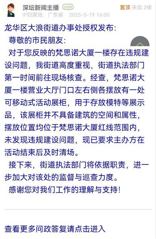 尊敬的市民朋友:對于您反映的梵思諾大廈一樓存在違規(guī)建設(shè)問題,我街道高度重視,街道執(zhí)法部門第一時間前往現(xiàn)場核查。經(jīng)查,梵思諾大廈一樓營業(yè)大廳門口左右側(cè)各擺放有一處可移動式活動展柜,用于存放模特等展示品,該展柜并不具備建筑的空間和屬性,擺放位置均位于梵思諾大廈紅線范圍內(nèi),未發(fā)現(xiàn)違規(guī)建設(shè)問題,現(xiàn)已要求主辦方在活動結(jié)束后及時清場。接下來,街道執(zhí)法部門將依據(jù)職責(zé),進(jìn)一步加大對該處的監(jiān)督與巡查力度。感謝您對我們工作的理解與支持!