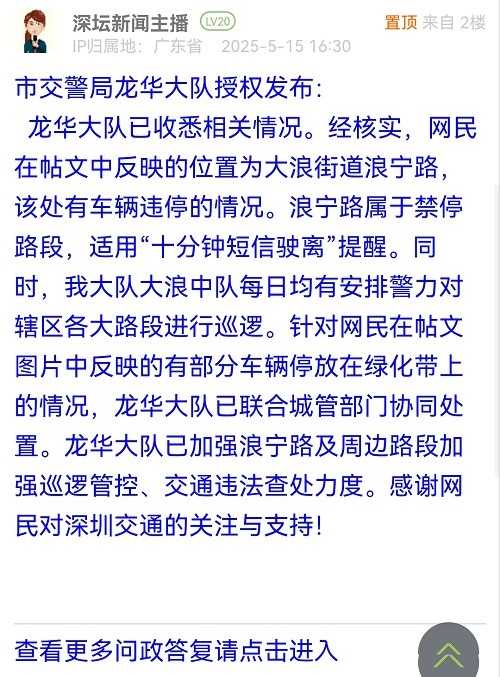龍華大隊已收悉相關(guān)情況。經(jīng)核實,網(wǎng)民在帖文中反映的位置為大浪街道浪寧路,該處有車輛違停的情況。浪寧路屬于禁停路段,適用“十分鐘短信駛離”提醒。同時,我大隊大浪中隊每日均有安排警力對轄區(qū)各大路段進(jìn)行巡邏。針對網(wǎng)民在帖文圖片中反映的有部分車輛停放在綠化帶上的情況,龍華大隊已聯(lián)合城管部門協(xié)同處置。龍華大隊已加強(qiáng)浪寧路及周邊路段加強(qiáng)巡邏管控、交通違法查處力度。感謝網(wǎng)民對深圳交通的關(guān)注與支持!