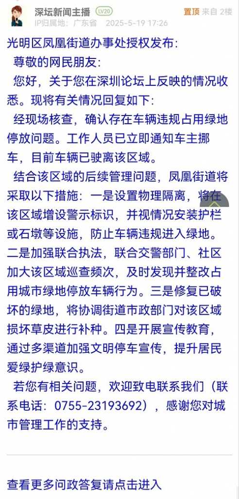 尊敬的網(wǎng)民朋友:您好,關(guān)于您在深圳論壇上反映的情況收悉?,F(xiàn)將有關(guān)情況回復(fù)如下:經(jīng)現(xiàn)場核查,確認(rèn)存在車輛違規(guī)占用綠地停放問題。工作人員已立即通知車主挪車,目前車輛已駛離該區(qū)域。結(jié)合該區(qū)域的后續(xù)管理問題,鳳凰街道將采取以下措施:一是設(shè)置物理隔離,將在該區(qū)域增設(shè)警示標(biāo)識,并視情況安裝護(hù)欄或石墩等設(shè)施,防止車輛違規(guī)進(jìn)入綠地。二是加強(qiáng)聯(lián)合執(zhí)法,聯(lián)合交警部門、社區(qū)加大該區(qū)域巡查頻次,及時發(fā)現(xiàn)并整改占用城市綠地停放車輛行為。三是修復(fù)已破壞的綠地,將協(xié)調(diào)街道市政部門對該區(qū)域損壞草皮進(jìn)行補(bǔ)種。四是開展宣傳教育,通過多渠道加強(qiáng)文明停車宣傳,提升居民愛綠護(hù)綠意識。若您有相關(guān)問題,歡迎致電聯(lián)系我們(聯(lián)系電話:0755-23193692),感謝您對城市管理工作的支持。