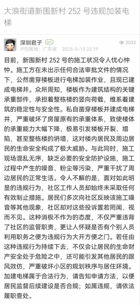 8. 帖文《大浪街道新圍新村 252 號違規(guī)加裝電梯》