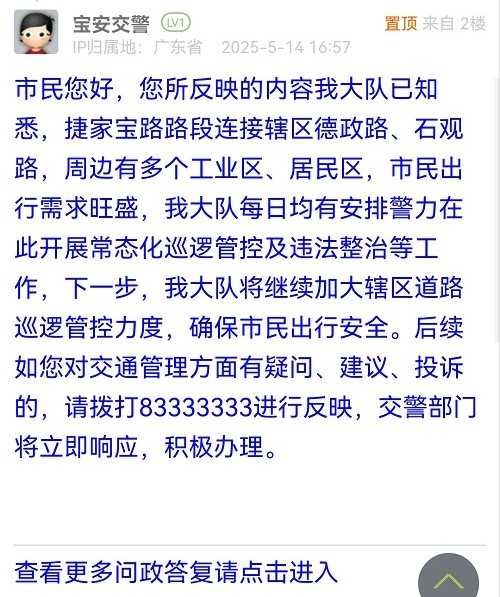 市民您好,您所反映的內(nèi)容我大隊已知悉,捷家寶路路段連接轄區(qū)德政路、石觀路,周邊有多個工業(yè)區(qū)、居民區(qū),市民出行需求旺盛,我大隊每日均有安排警力在此開展常態(tài)化巡邏管控及違法整治等工作,下一步,我大隊將繼續(xù)加大轄區(qū)道路巡邏管控力度,確保市民出行安全。后續(xù)如您對交通管理方面有疑問、建議、投訴的,請撥打83333333進(jìn)行反映,交警部門將立即響應(yīng),積極辦理。