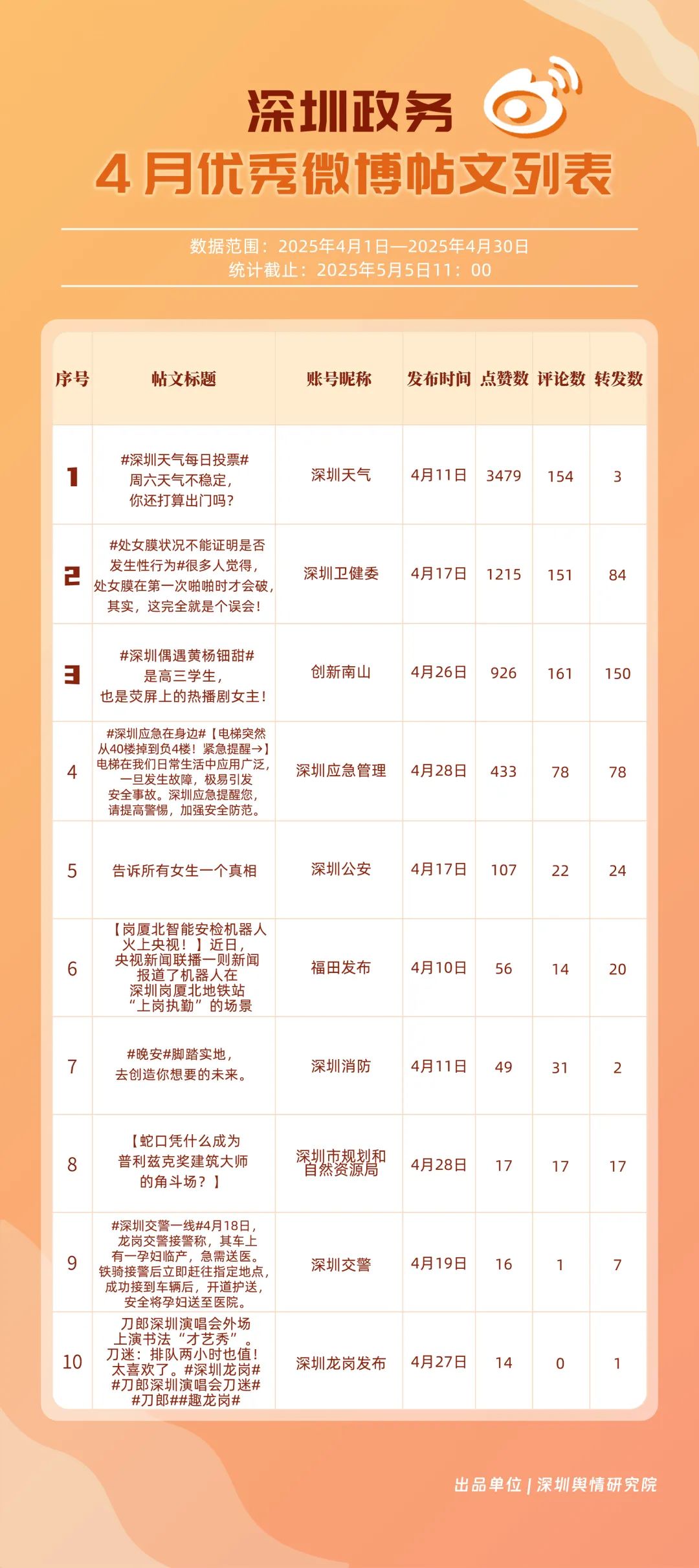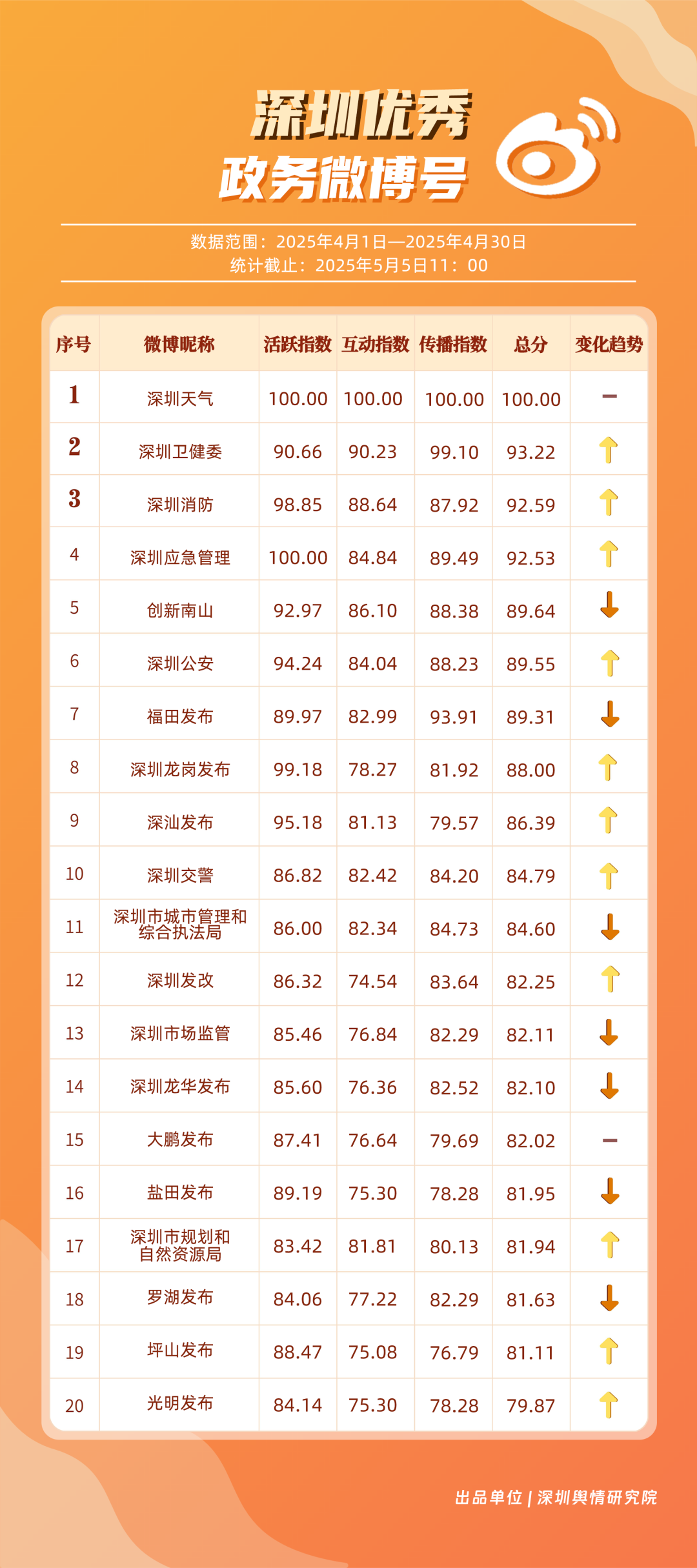 4月,“深圳天氣”“深圳衛(wèi)健委”“深圳消防”“深圳應(yīng)急管理”“創(chuàng)新南山”“深圳公安”“福田發(fā)布”“深圳龍崗發(fā)布”“深汕發(fā)布”“深圳交警”等20個(gè)賬號(hào)入選“優(yōu)秀政務(wù)微博號(hào)”。值得一提的是,“深圳天氣”在多個(gè)指標(biāo)中獲得滿分,其氣象信息的趣味性和實(shí)用性受到市民認(rèn)可;“深圳衛(wèi)健委”“深圳消防”“深圳應(yīng)急管理”也在信息傳播、互動(dòng)服務(wù)等方面持續(xù)發(fā)力,以超過90分的總分緊跟其后;“深汕發(fā)布”“深圳交警”相較于3月在榜單排名有所提升,展現(xiàn)出強(qiáng)勁的發(fā)展勢(shì)頭。這些優(yōu)秀政務(wù)微博號(hào)的脫穎而出,不僅體現(xiàn)了各自的運(yùn)營實(shí)力,更反映出深圳政務(wù)新媒體在微博平臺(tái)的蓬勃發(fā)展態(tài)勢(shì)。