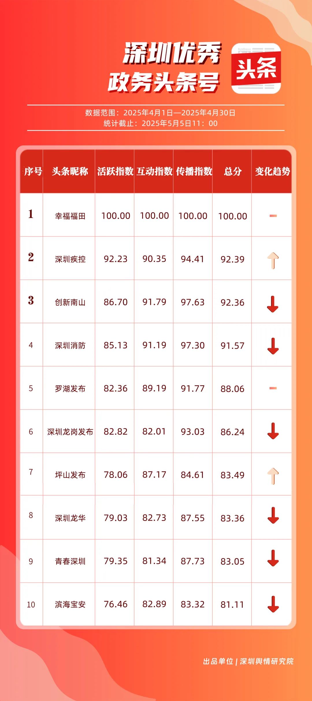 4月,“幸福福田”“深圳疾控”“創(chuàng)新南山”“深圳消防”“羅湖發(fā)布”“深圳龍崗發(fā)布”“坪山發(fā)布”“深圳龍華”“青春深圳”“濱海寶安”共10個(gè)政務(wù)頭條號(hào)入選“優(yōu)秀政務(wù)頭條號(hào)”榜單。“幸福福田”延續(xù)上月的優(yōu)異表現(xiàn),以優(yōu)質(zhì)的內(nèi)容輸出和穩(wěn)定的用戶互動(dòng),位列榜單首位,成為政務(wù)頭條號(hào)的標(biāo)桿;“深圳疾控”則以92.39分的亮眼成績排在榜單第二位,凸顯了政務(wù)新媒體在公共衛(wèi)生領(lǐng)域的傳播成果;“創(chuàng)新南山”“深圳消防”“羅湖發(fā)布”緊隨其后,分別在城區(qū)形象宣傳、消防安全領(lǐng)域等方面深耕細(xì)作,持續(xù)擴(kuò)大政務(wù)信息的覆蓋面與影響力。