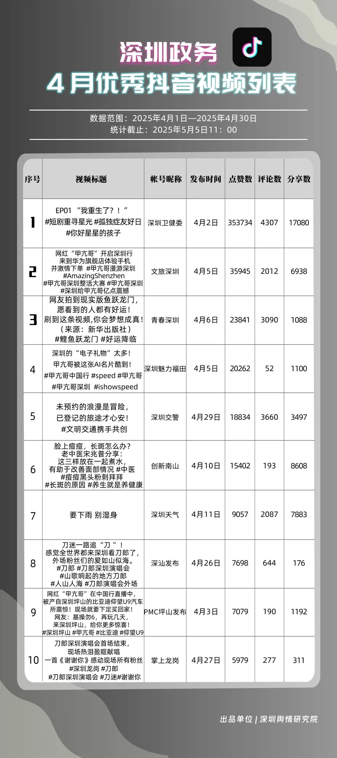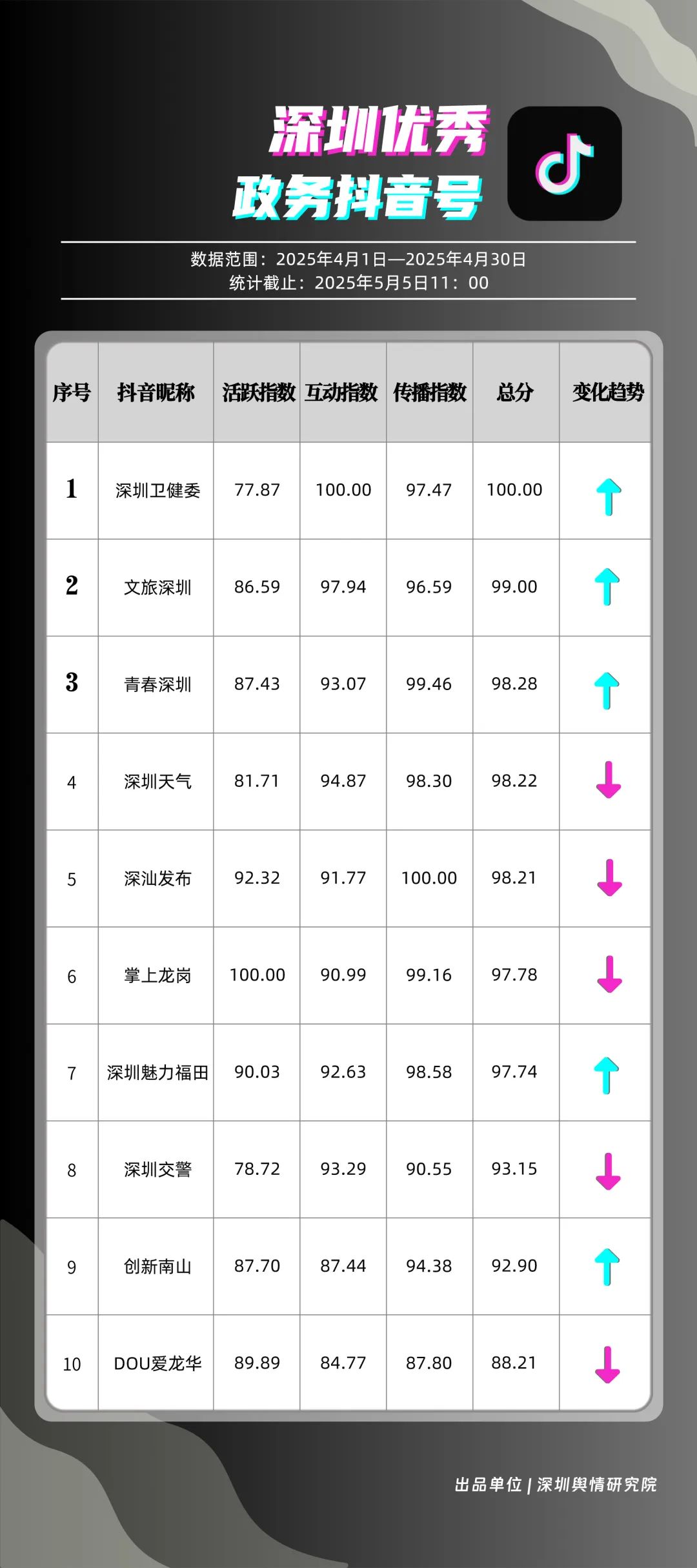 4月,“深圳衛(wèi)健委”“文旅深圳”“青春深圳”“深圳天氣”“深汕發(fā)布”“掌上龍崗”“深圳魅力福田”“深圳交警”“創(chuàng)新南山”“DOU愛龍華”共10個(gè)政務(wù)抖音號(hào)獲得“優(yōu)秀政務(wù)抖音號(hào)”稱號(hào)。4月,“深圳衛(wèi)健委”“文旅深圳”“青春深圳”憑借新穎的內(nèi)容策劃、生動(dòng)的短視頻呈現(xiàn)方式,實(shí)現(xiàn)排名提升,位居榜單前三?!吧钲谔鞖狻薄吧钌前l(fā)布”緊隨其后,以優(yōu)質(zhì)實(shí)用的內(nèi)容、接地氣的表達(dá),持續(xù)擴(kuò)大政務(wù)新媒體的傳播聲量。上榜賬號(hào)積極探索創(chuàng)新傳播路徑,以生動(dòng)有趣的方式傳遞政務(wù)信息,為深圳政務(wù)新媒體在短視頻領(lǐng)域的發(fā)展注入新活力。